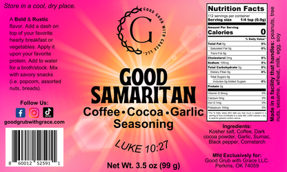 Ingredients: Kosher Salt, Coffee, Dark Cocoa Powder, Garlic Powder, Dried Sumac, Black Pepper, Cornstarch.